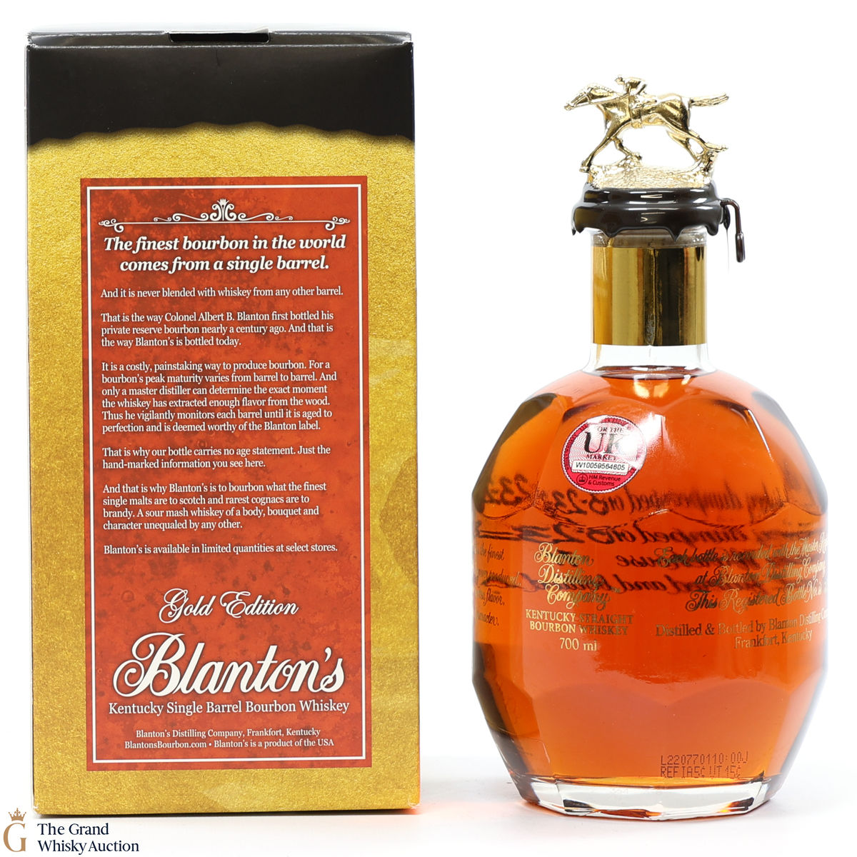 PLEASE NOTE: The wax seal on Blanton's bottles are prone to cracking in transit due to their design. Therefore, as stated in our T&C’s, we do not and will not accept liability should the seal be breached, broken, split or leak in transit. Additionally, please know due to the design of the internal cardboard packaging that surrounds the top of the bottles, it too may be torn. By bidding on this lot you have understood this to be true. Insurance is for complete breakage or loss in transit only.