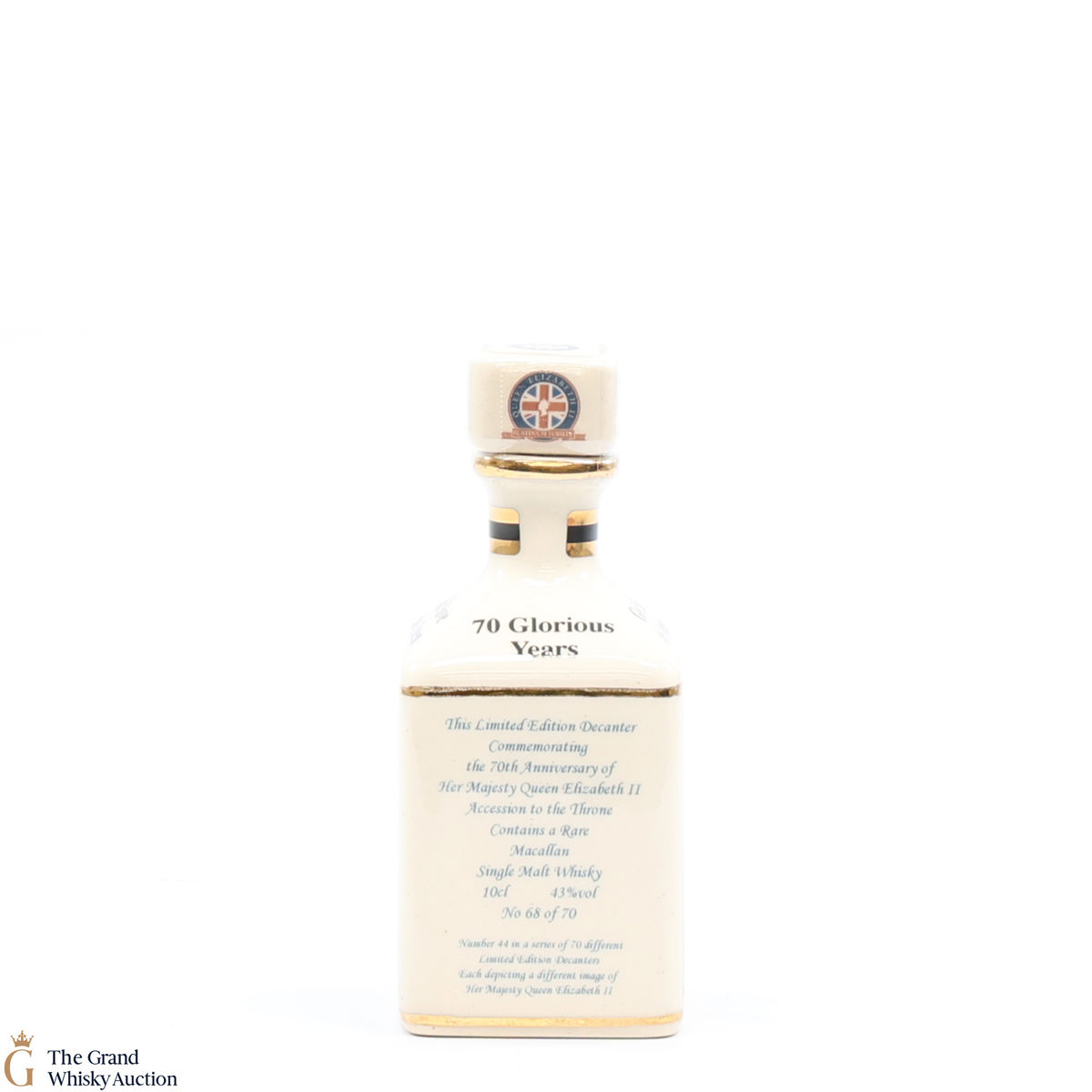 A mini decanter commemorating the 70th Anniversary of Her Majesty Queen Elizabeth II Accession to the Throne. Filled with a rare Macallan, there were only 70 full sets released which consisted of 70 different bottles.