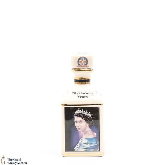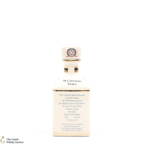 A mini decanter commemorating the 70th Anniversary of Her Majesty Queen Elizabeth II Accession to the Throne. Filled with a rare Macallan, there were only 70 full sets released which consisted of 70 different bottles.