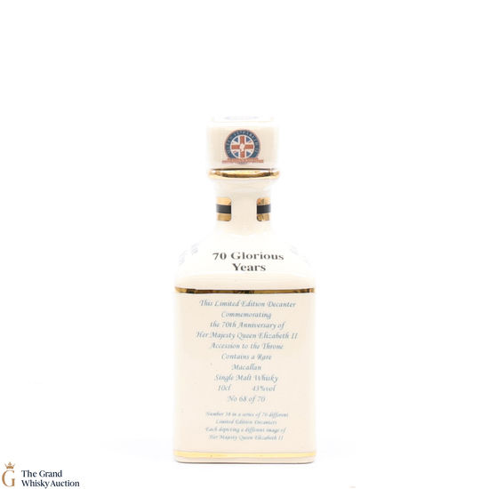 A mini decanter commemorating the 70th Anniversary of Her Majesty Queen Elizabeth II Accession to the Throne. Filled with a rare Macallan, there were only 70 full sets released which consisted of 70 different bottles.