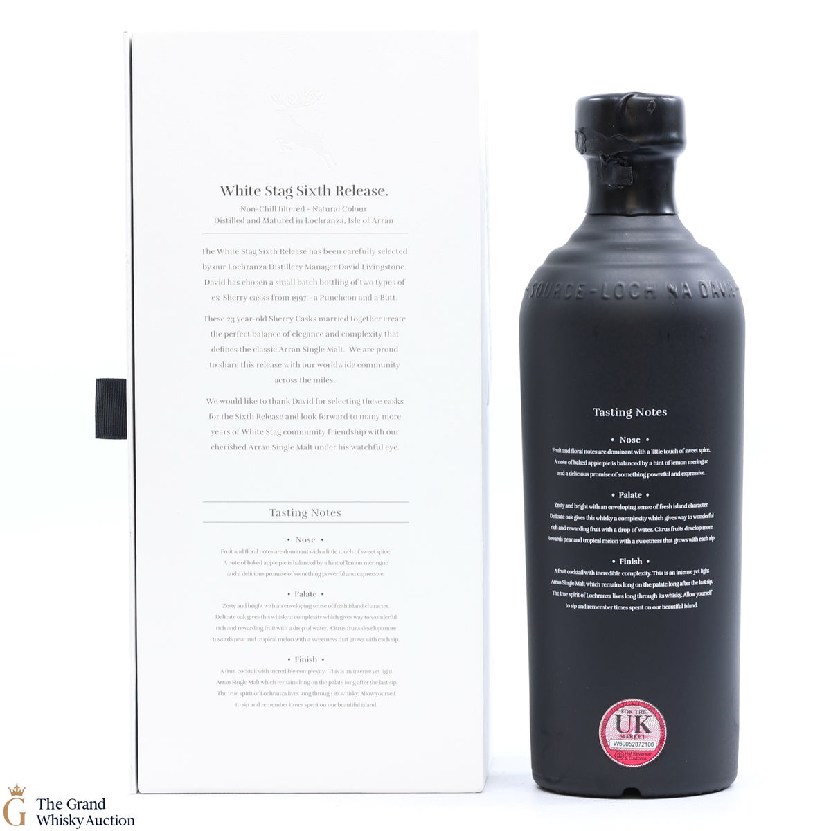 Distilled at Arran Distillery, this is the 6th release of their White Stag. Chosen by Distillery Manager David Livingstone, this single malt was originally distilled in 1997. David Livingstone picked out a Sherry Hogshead and a Sherry Puncheon which were married together, the resulting whisky being 23 years old.