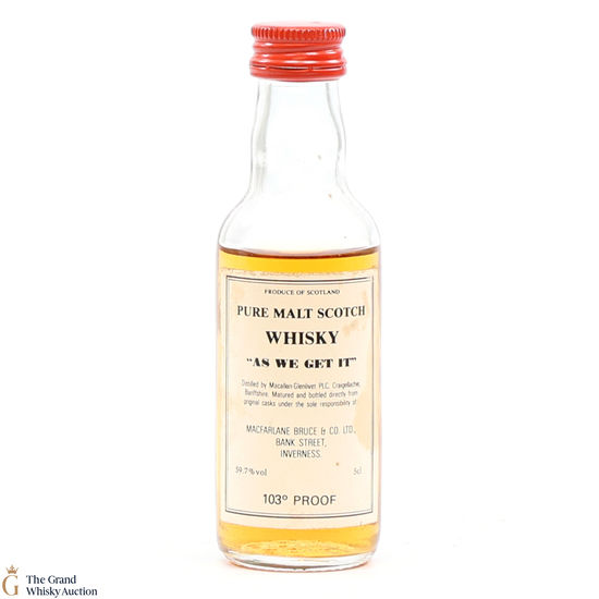 This is an old 5cl bottling of cask strength Macallan, bottled by Macfarlane Bruce & Co. Ltd. in the 1980s. Bottled for their 'As We Get It' series, the whisky is bottled at cask strength and at natural colouring.