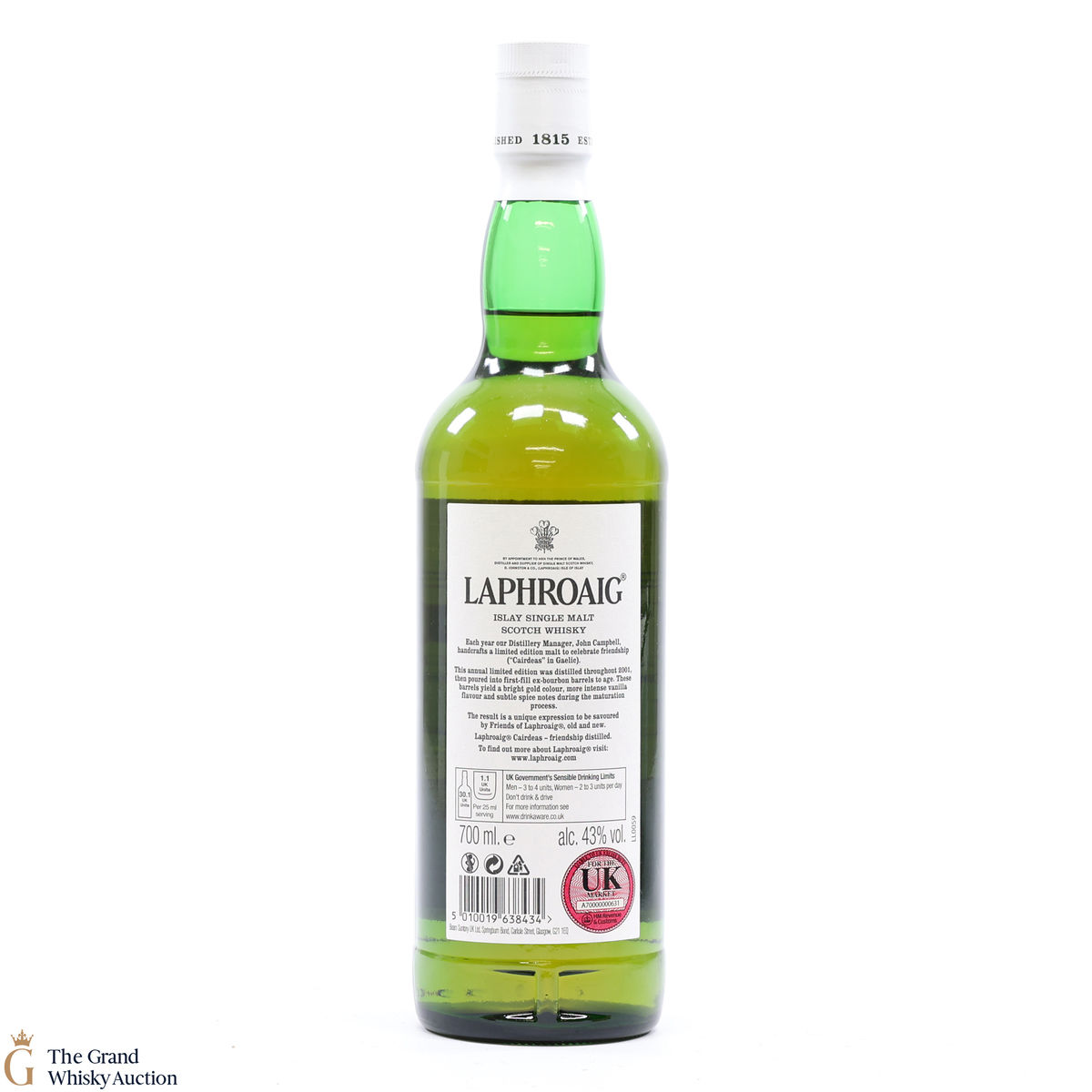Distilled throughout the year of 2001, this 15 year old Laphroaig single malt was released as the annual Cairdeas line of bottlings.