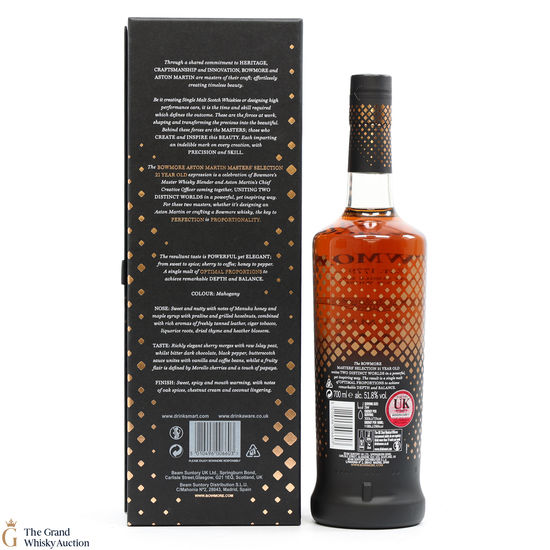 This 21-Year-Old Bowmore is a limited-edition single malt created in collaboration between Ron Welsh, Bowmore Master Blender and Marek Reichman, Aston Martin Chief Creative Officer. Matured in a combination of oloroso and Pedro Ximenez sherry casks. The result is a single malt that thrills all the senses for optimal enjoyment.