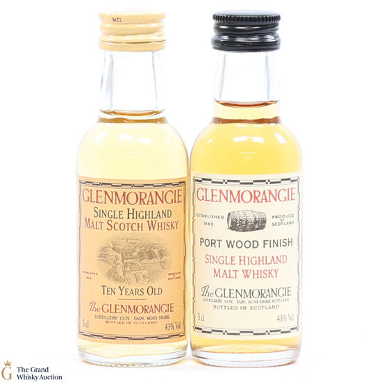 Glenmorangie - Port Wood, 5cl: A rare and discontinued 1990s Glenmorangie Port Wood Finish. Aged for at least 12 years in American oak casks before being finished in Port pipes. 43%.