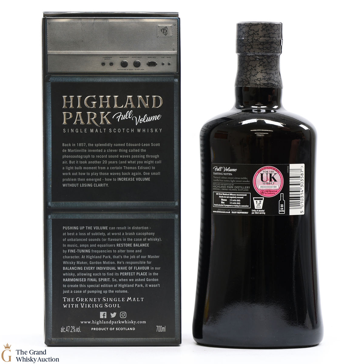 Full Volume by Highland Park was distilled in 1999 and bottled in 2017 from 481 casks. The single malt was matured exclusively in first-fill bourbon casks and was bottled at 47.2% ABV and comes presented in a themed presentation box resembling speaker.