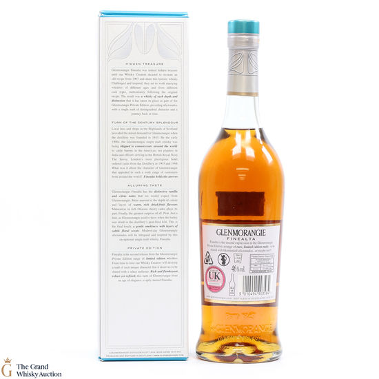 Finealta is the second in Glenmorangie's series of Private Editions (following Sonnalta). Finealta was produced using some lightly peated barley. The name is Gaelic for 'Elegance' and it was matured in ex-sherry & plain new American oak casks.