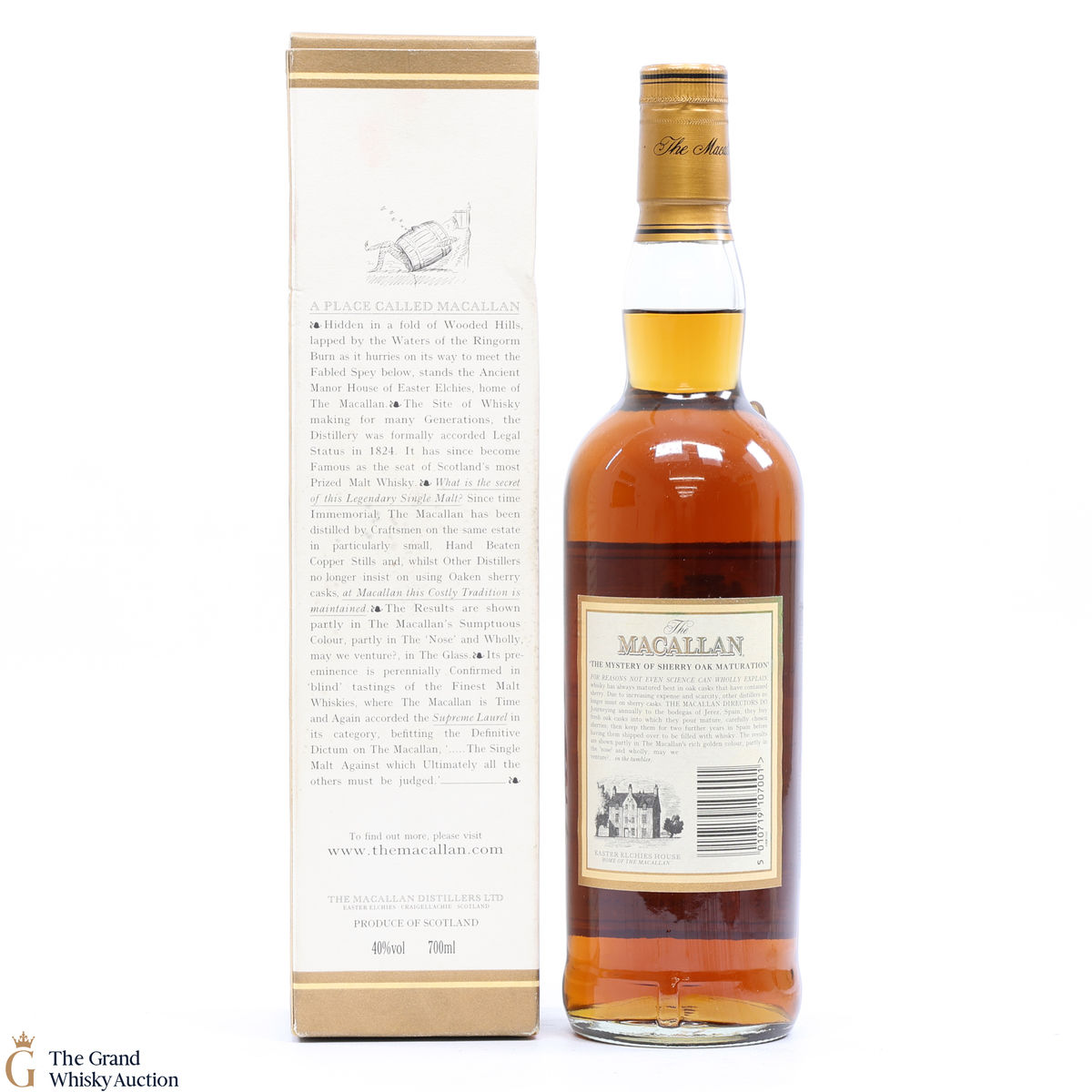 An old bottling of Macallan 10-year-old, which has been exclusively matured in sherry oak casks. Bottled in the early 2000's.