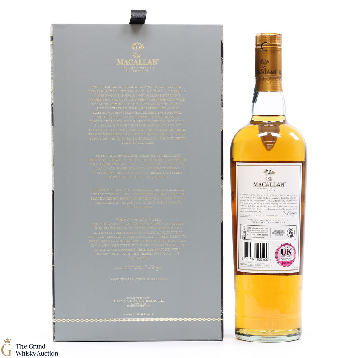 A stylish Macallan gift pack. It contains a 70cl bottle of the Gold expression from their 1824 Series, and two limited edition branded Macallan Whisky tumblers.