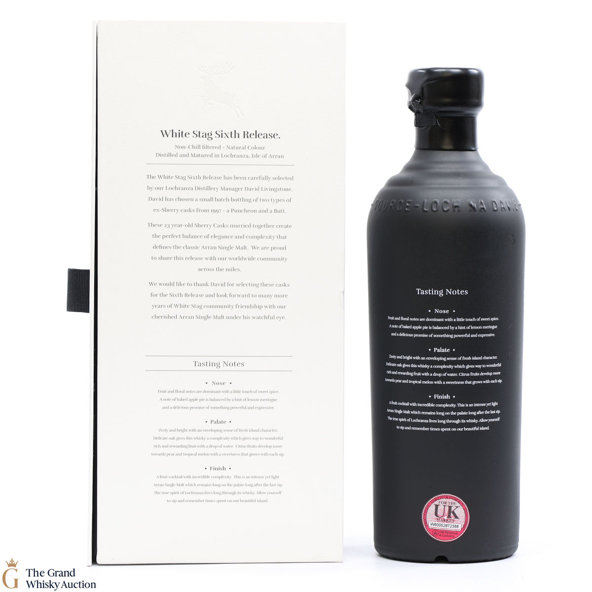 Distilled at Arran Distillery, this is the 6th release of their White Stag. Chosen by Distillery Manager David Livingstone, this single malt was originally distilled in 1997. David Livingstone picked out a Sherry Hogshead and a Sherry Puncheon which were married together, the resulting whisky being 23 years old.