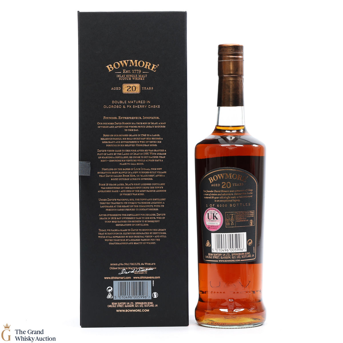 This 20-year-old celebrates and is a testament to the founder of Bowmore. This dram has gone through a double maturation period of 15 years in Oloroso Sherry Butts followed by 5 years in a first fill PX Butts. One of only 6000 bottles.