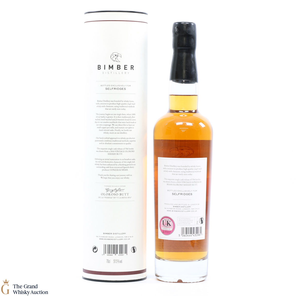 An exclusive partnership between the London distillery and department store Selfridges. This Bimber was made from single farm barley (which was malted at Westminster Maltings) and matured in four 1st fill American Oak Ex-bourbon casks. It was then finished in a single Oloroso sherry butt from hugely renowned Spanish sherry producer González Byass. Bottled in June 2020 at 51.5% ABV.