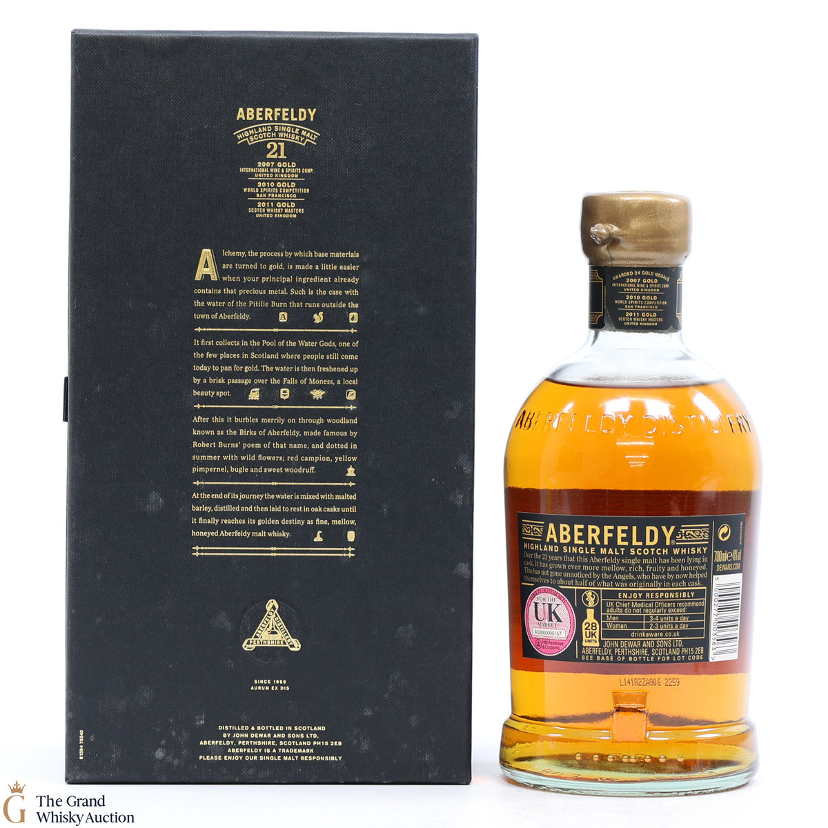Due to the various ages of bottles and their seals, the condition of liquid is at the buyer's discretion and no claim can be lodged against failure/leakage in transit. Loss and breakage cover is available at 3% of the hammer price as standard. If the lot is not insured, no claim can be lodged against the courier or The Grand Whisky Auction for breakage or loss in transit.