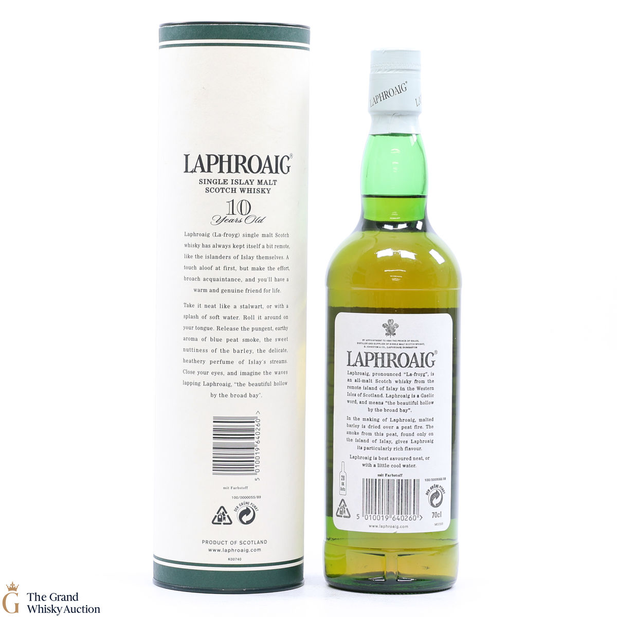 A 70cl of the medicinal 10 year old from Islay's bestselling distillery, Laphroaig. In making Laphroaig, malted barley is dried over a peat fire. The smoke from this peat, found only on Islay, gives Laphroaig its particularly rich flavour.