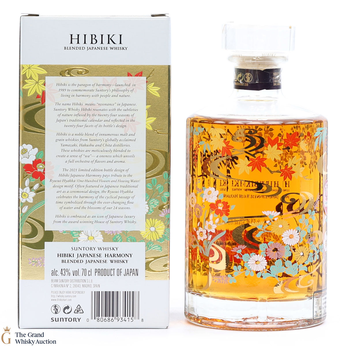 This is a limited edition, specially designed bottle with painted flowers and flowing ribbons of water. The 2021 special edition pays homage to the Ryisui-Hyakka (One Hundred Flowers and Flowing Water) and celebrates different seasonal flowers which help characterise the Japanese seasons. 5 types of casks were used and in typical Hibiki fashion, the bottle always has 24 facets which represent 24 seasons in the Japanese lunar calendar.