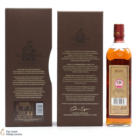 Single malt Irish whiskey, triple distilled and matured in bourbon and oloroso sherry casks for notes of honey, vanilla and ripe fruit. Bottled to celebrate the 400th anniversary of the original grant to distil.