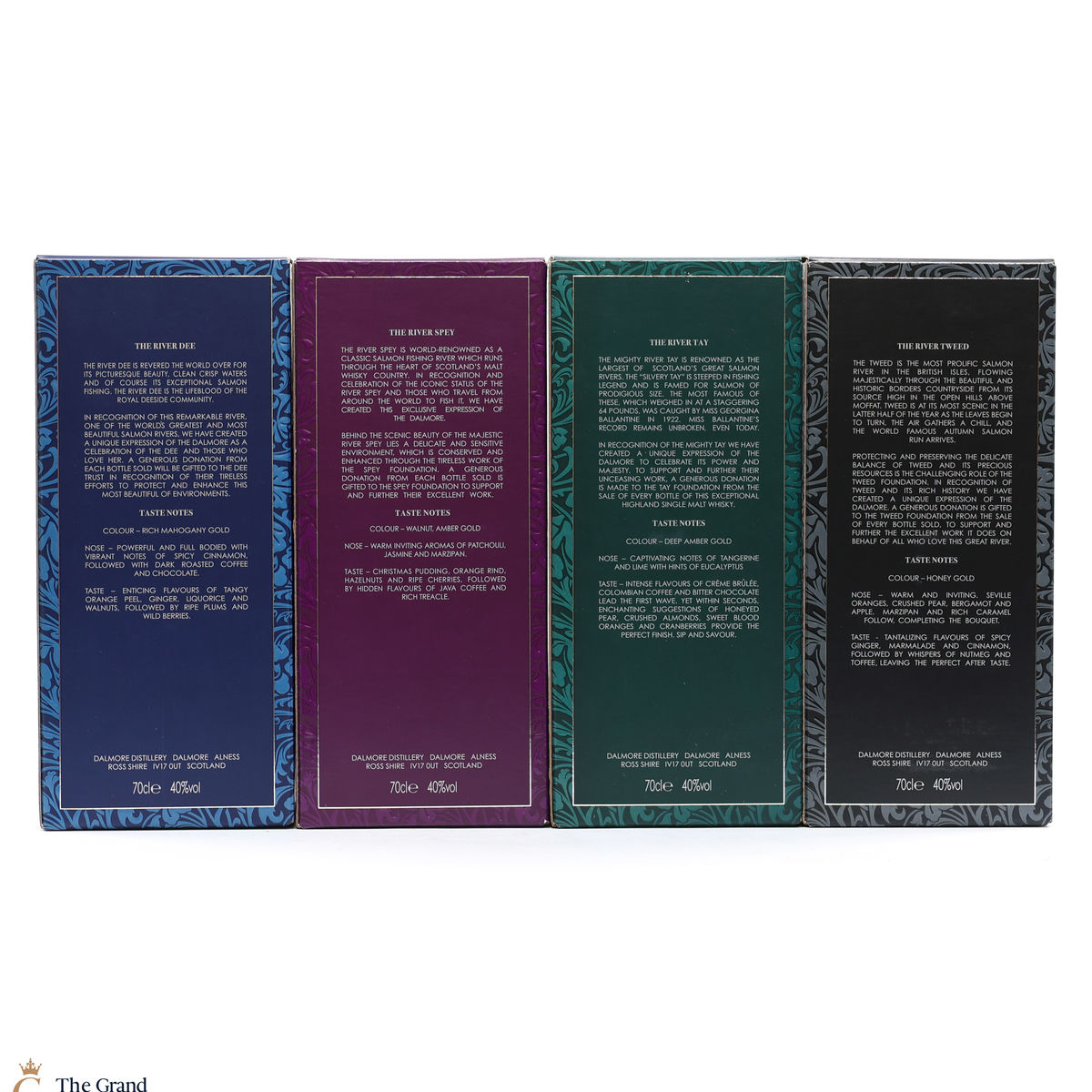 The Dalmore Rivers Collection includes four bottlings named after four famous Scottish Salmon rivers, The Dee, The Spey, The Tweed and The Tay. Each expression was bottled at 40%. This lot includes 4 x 70cl bottlings.