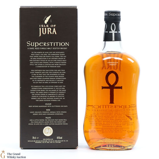 A lightly peated single malt made up of different ages. It is named after the fact that Islanders were very superstitious in the past, this is a nod to them, and to the Island of Jura which is still dotted with ancient stones and markings. When you raise a glass of this whisky, you're raising a glass to the ancient ways of the island.