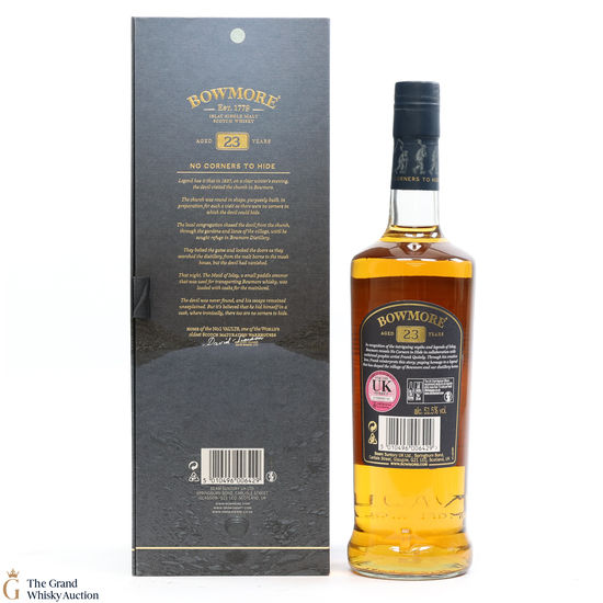 The limited release Bowmore No Corners to Hide 23 Year Old was matured for 21 years in ex-bourbon American oak hogsheads and finished for two years in Essencia barriques. Bottled at 51.5% ABV.