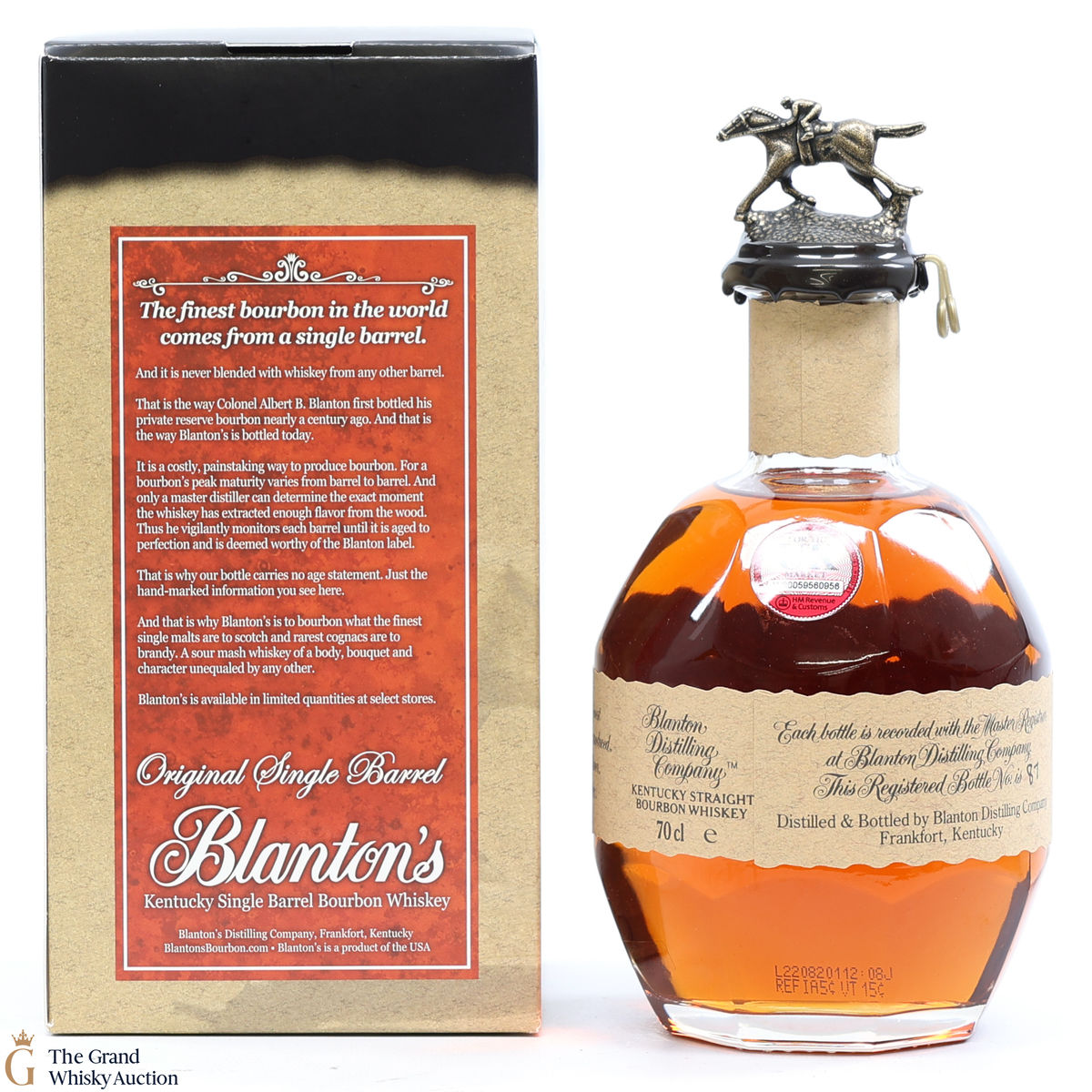 PLEASE NOTE: The wax seal on Blanton's bottles are prone to cracking in transit due to their design. Therefore, as stated in our T&C’s, we do not and will not accept liability should the seal be breached, broken, split or leak in transit. Additionally, please know due to the design of the internal cardboard packaging that surrounds the top of the bottles, it too may be torn. By bidding on this lot you have understood this to be true. Insurance is for complete breakage or loss in transit only.