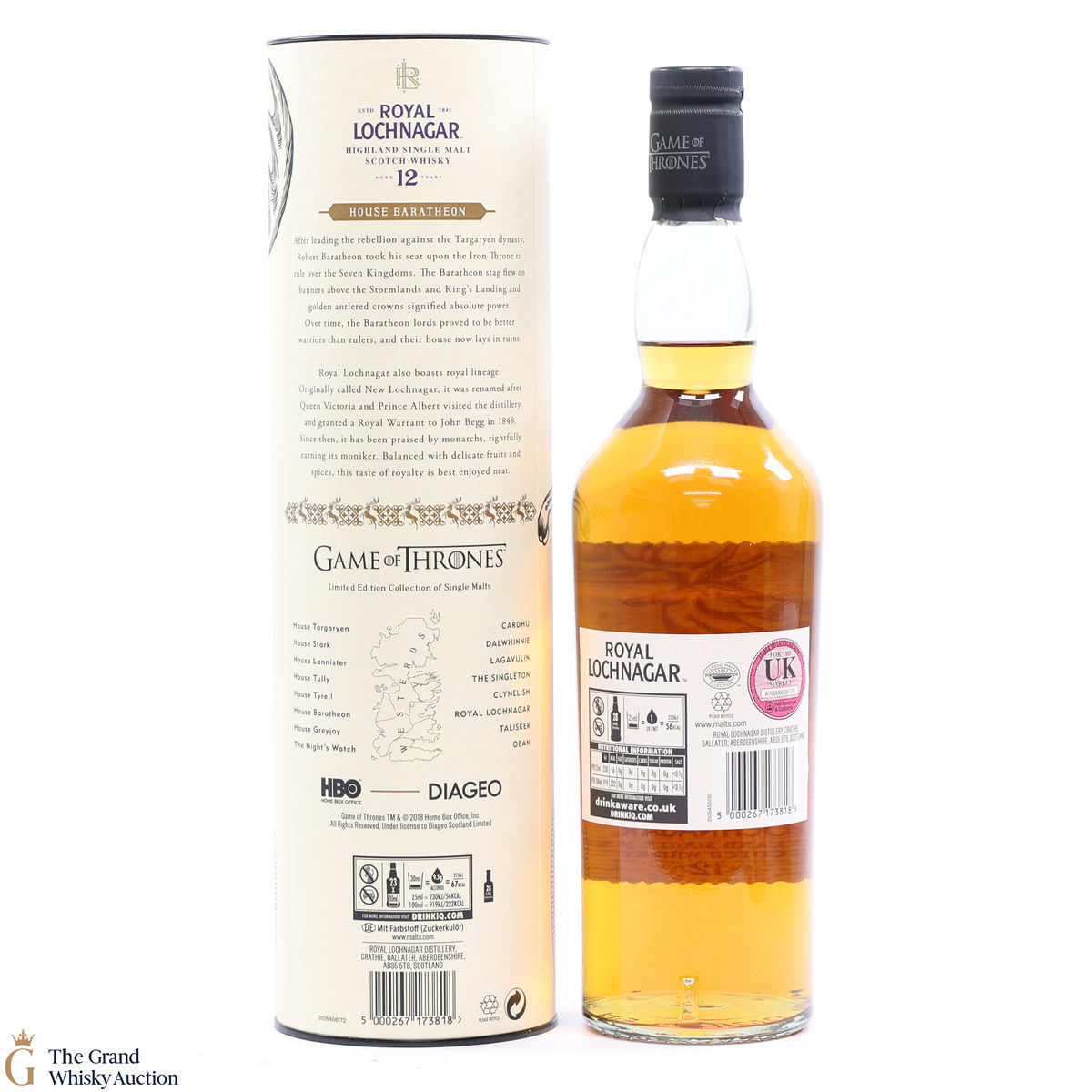 This is a limited-edition 12 year old single malt from Royal Lochnagar and it is part of Diagio's 2018 collaboration with HBO. Each single malt in the series relates to the land of houses of the Game of Thrones television series. The Royal Lochnagar bottle is decorated with a rampant black Stag, the sigil of House Baratheon that once flew on banners above the Stormlands and King’s Landing signifying absolute power.