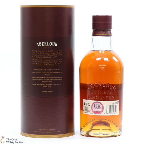 This Aberlour 12 Year Old, has been double cask matured in two handmade oak cask types. The double maturation both traditional oak and sherry casks adds depth of character to this single malt, now bottled at 40% abv.