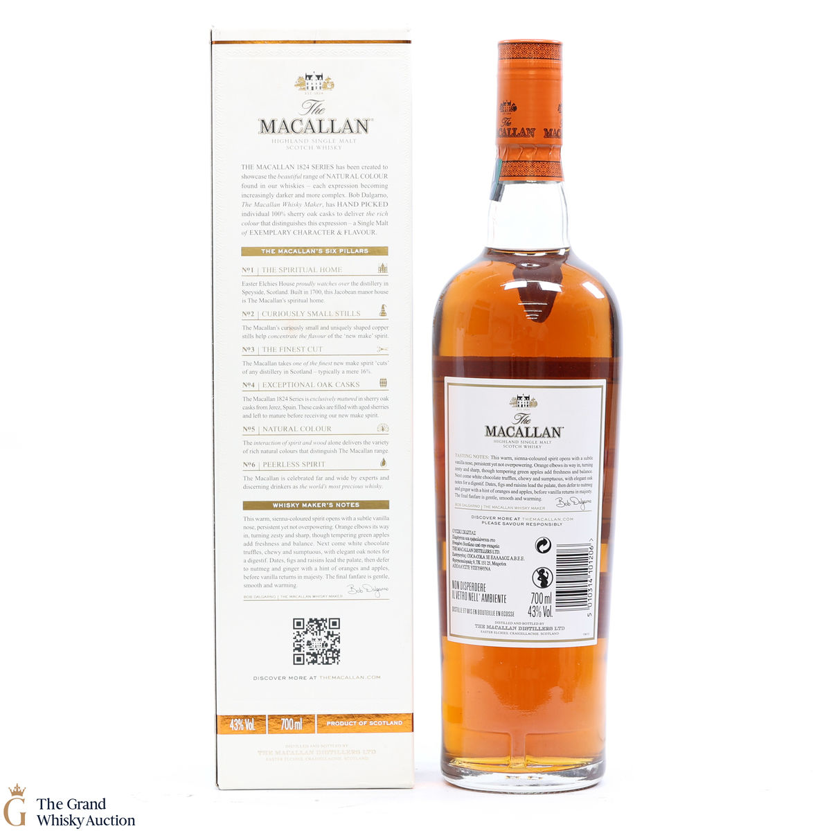 The Macallan 1824 Series celebrates natural colour. The most distinctive and defining characteristic of Macallan is the sherry-seasoned oak casks that are used to mature the whisky. This series shows commitment to 100% natural colour, drawn from wood. The colour of each expression becomes deeper as the range progresses.