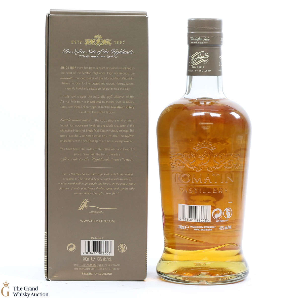 Due to the various ages of bottles and their seals, the condition of liquid is at the buyer's discretion and no claim can be lodged against failure/leakage in transit. Loss and breakage cover is available at 3% of the hammer price as standard. If the lot is not insured, no claim can be lodged against the courier or The Grand Whisky Auction for breakage or loss in transit.
