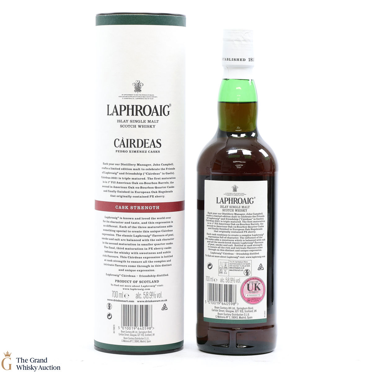 The 2021 edition of Laphroaigs Cairdeas series was first matured in a 1st fill American oak ex-bourbon barrel, then in an American oak ex-bourbon quarter cask before finally being finished in European PX sherry casks. Bottled at the cask strength of 58.9% ABV in 2021 to celebrate the Friends of Laphroaig.