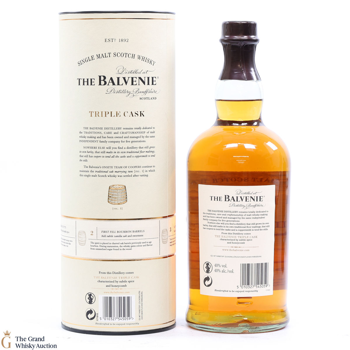 The 12 year old Triple Cask expression is part of Balvenie's travel retail range. It is made with whisky matured in three different types of cask, namely first-fill American oak barrels, traditional refill casks and first-fill Oloroso Sherry butts. Following the maturation, the whisky is married together to create a cohesive, flavoursome expression packed with orchard fruit, custard cream and cinnamon spice. This is a 1L bottling.