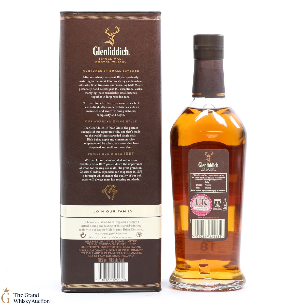 Matured in small batches the Glenfiddich 18 is arguably the most complex in the core range. The single malt has been matured in oloroso sherry and bourbon casks. It is very fragrant with tropical fruit and sherry cask influences, rich baked apple and cinnamon spice compliments by robust oak notes.