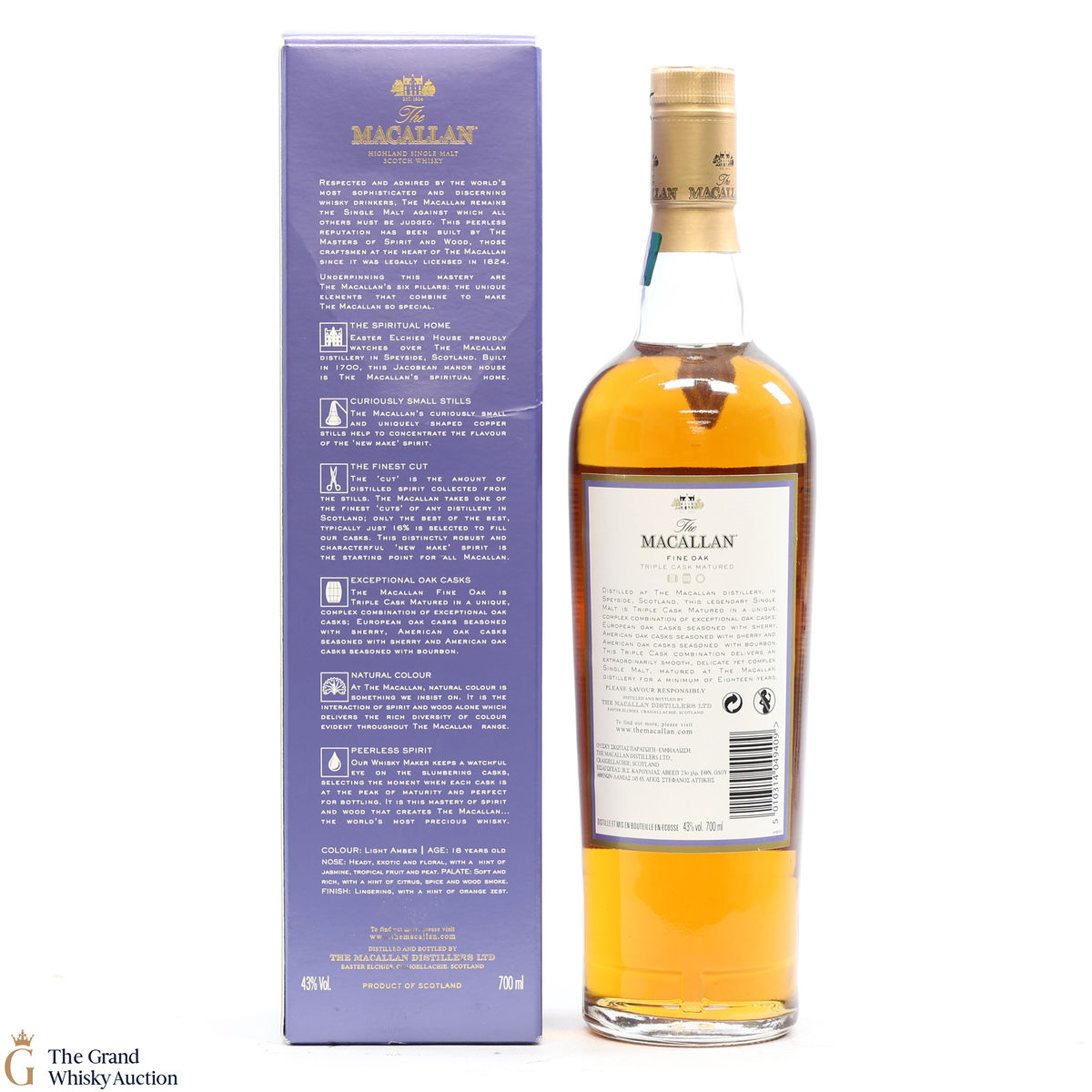 An 18-year-old single malt, part of Macallan's Fine Oak range. It has been matured for eighteen years in three oak cask types; Europen oak seasoned with sherry, American oak seasoned with sherry and American oak seasoned with bourbon. This complex combination of casks has created a light amber single malt with tropical flavours balanced with wood smoke.