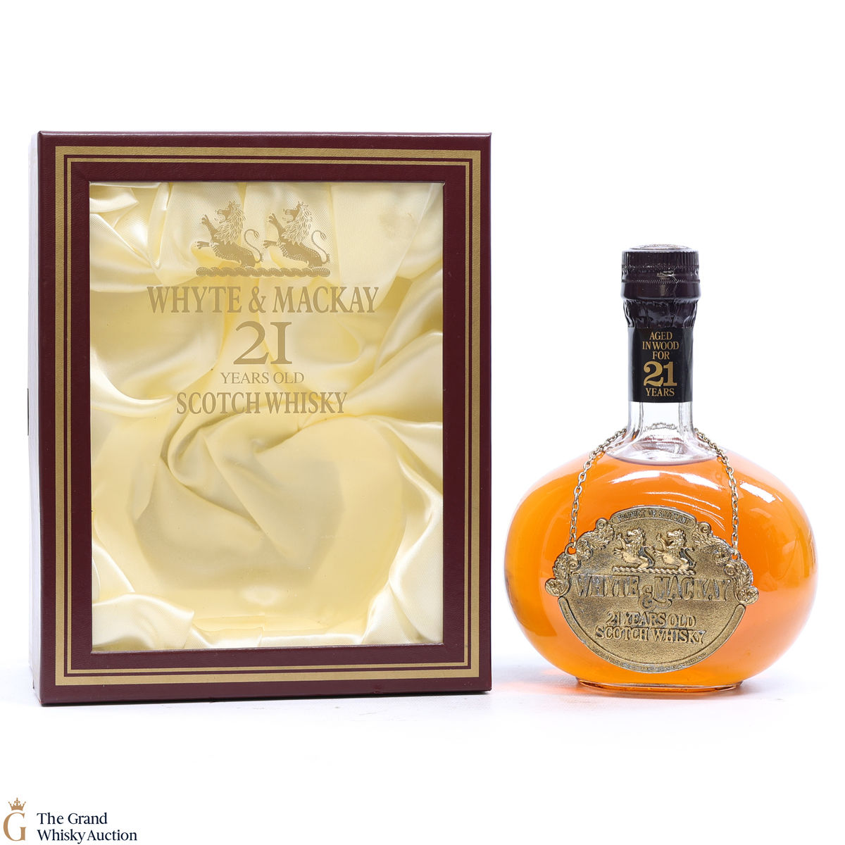 This is a very nicely presented bottle of 21-year-old blended whisky from Whyte & Mackay, which is believed to be produced in the 1980's. The bottle comes with a metallic tag that hangs from the neck of the decanter. It also comes in a beautiful silky lined presentation box.