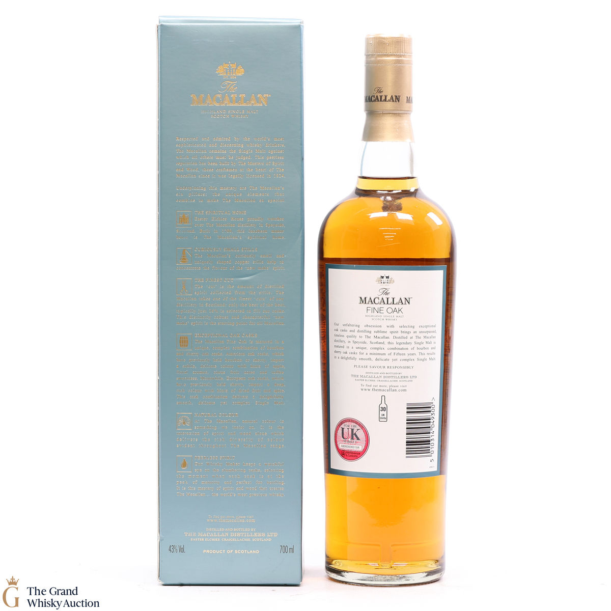 This 15 year old single malt is part of Macallan's Fine Oak, triple cask matured range. It has been matured for fifteen years in three oak cask types; Europen oak seasoned with sherry, American oak seasoned with sherry and American oak seasoned with bourbon. It is 'a rich straw whisky' with notes of cinnamon, rich chocolate and dried fruits. This bottle is an import.