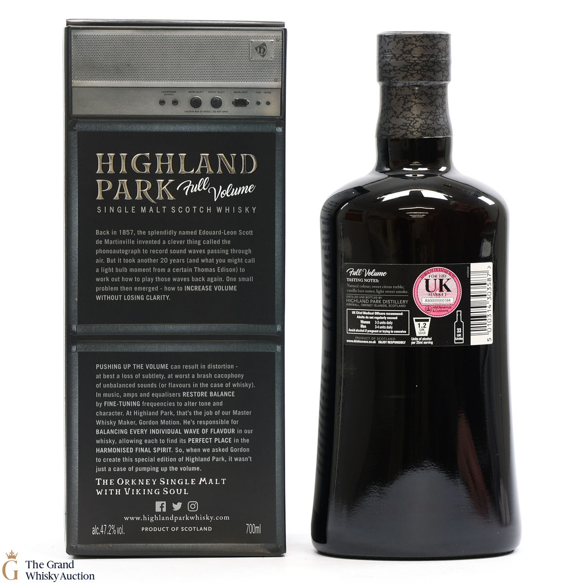 Full Volume by Highland Park was distilled in 1999 and bottled in 2017 from 481 casks. The single malt was matured exclusively in first-fill bourbon casks and was bottled at 47.2% ABV and comes presented in a themed presentation box resembling speaker.