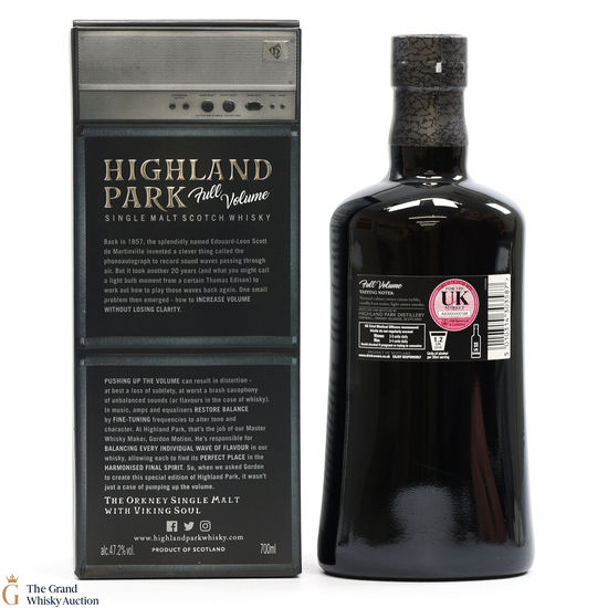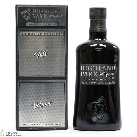 Full Volume by Highland Park was distilled in 1999 and bottled in 2017 from 481 casks. The single malt was matured exclusively in first-fill bourbon casks and was bottled at 47.2% ABV and comes presented in a themed presentation box resembling speaker.