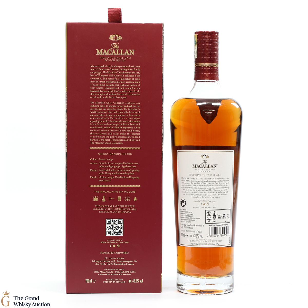 'Terra' single malt whisky from Macallan’s Quest Collection, is a complex whisky with a distinctive flavour of toffee, dried fruits, and rich, woody spices. Aged exclusively in first-fill European and American oak sherry seasoned casks, Terra has a golden amber colour, and aromas of dried fruits, lemon, and toffee.