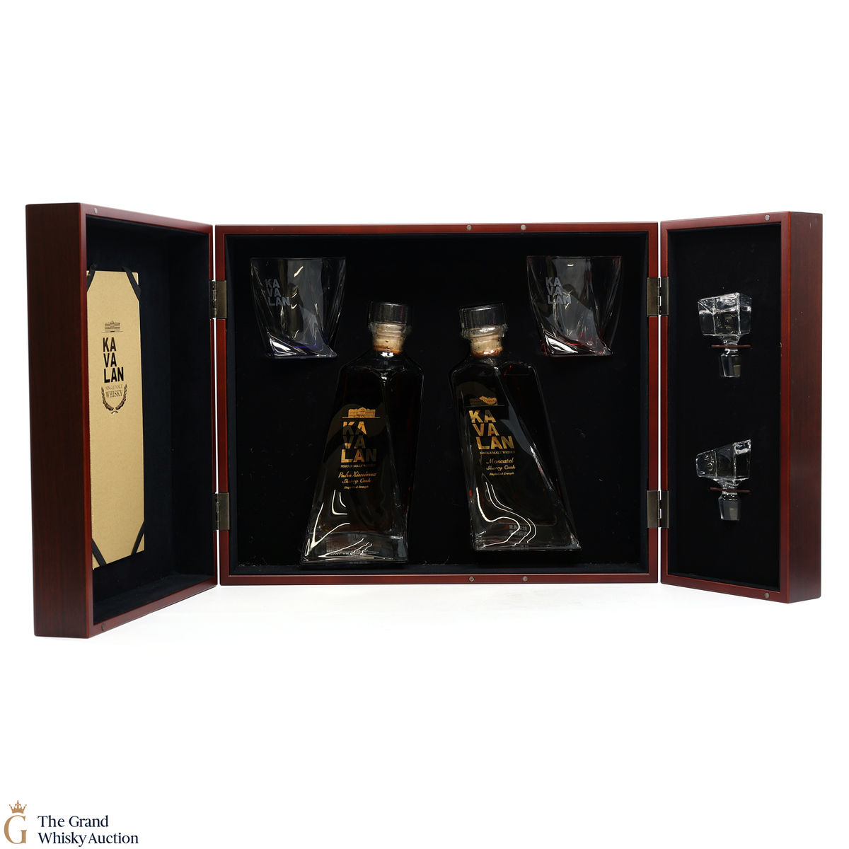This Kavalan gift set includes 2 x 50cl decanters of single-cask whisky bottled at cask strength, two glasses, and two bottle stoppers;