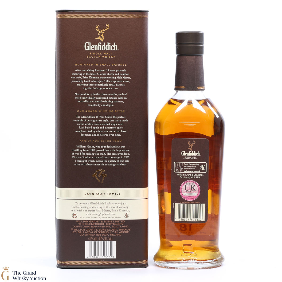 Matured in small batches the Glenfiddich 18 is arguably the most complex in the core range. The single malt has been matured in oloroso sherry and bourbon casks. It is very fragrant with tropical fruit and sherry cask influences, rich baked apple and cinnamon spice compliments by robust oak notes.