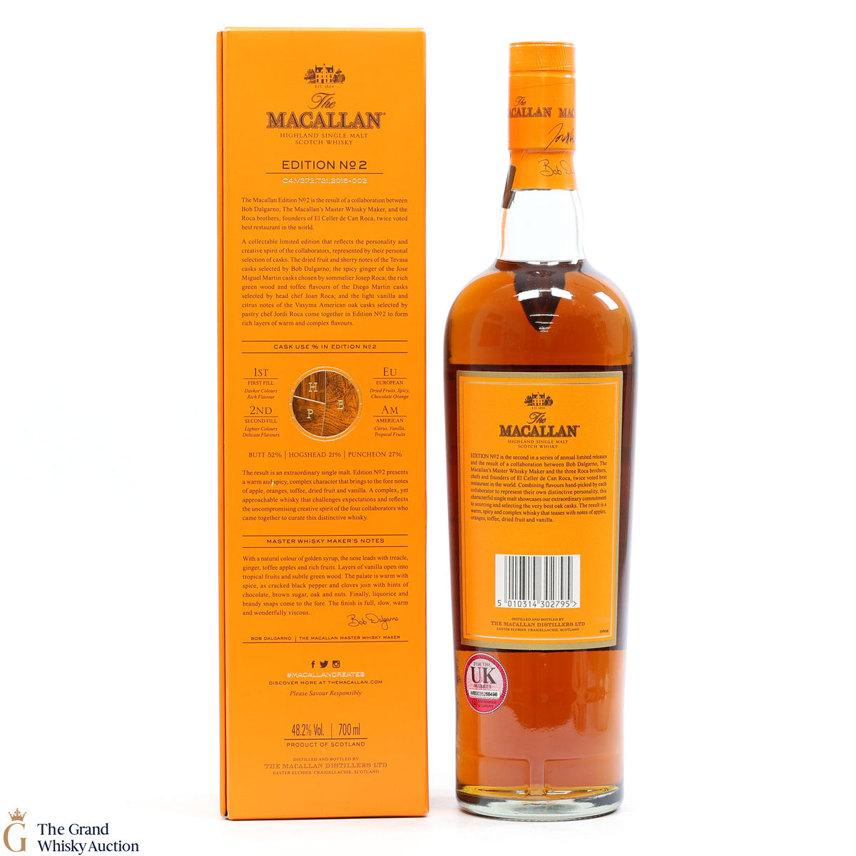 This is the second release from the Macallan Edition series. Edition No.2 is a collaboration between Macallan's master blender Bob Delgarno and legendary Spanish chefs Joan, Josep and Jordi Roca. The Rocas are the three brothers behind El Celler de Can Roca (named Best Restaurant in the World twice by Restaurant magazine). This single malt was drawn from a combination of sherry puncheons, butts and refill hogsheads.