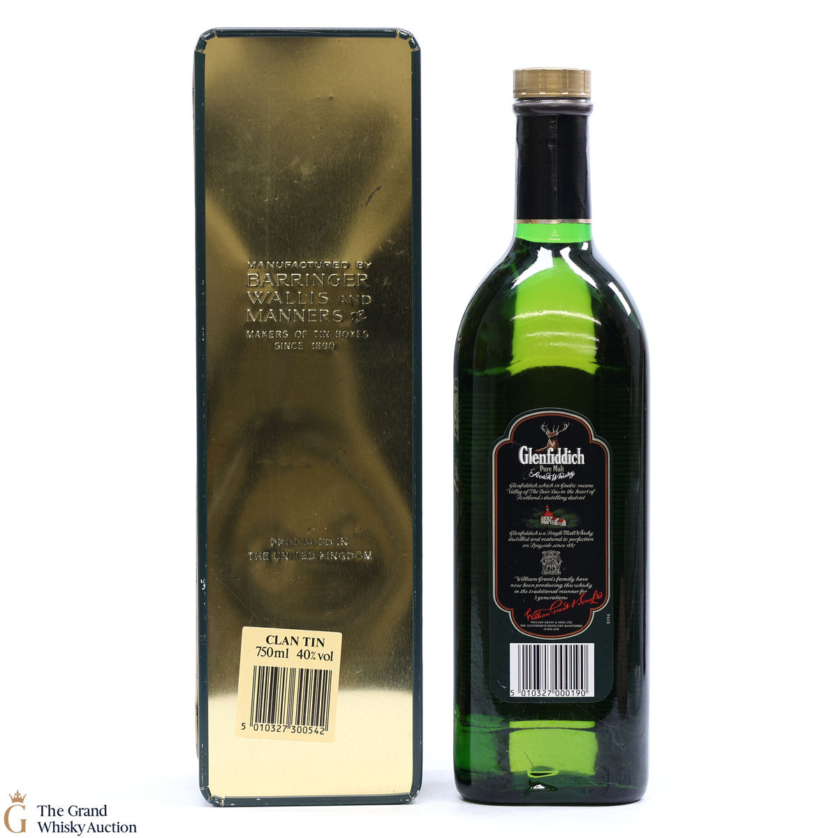 A collectable Glenfiddich single malt Scotch whisky from the 1980s in a Clans Of The Scottish Highlands presentation tin featuring Clan Drummond.
