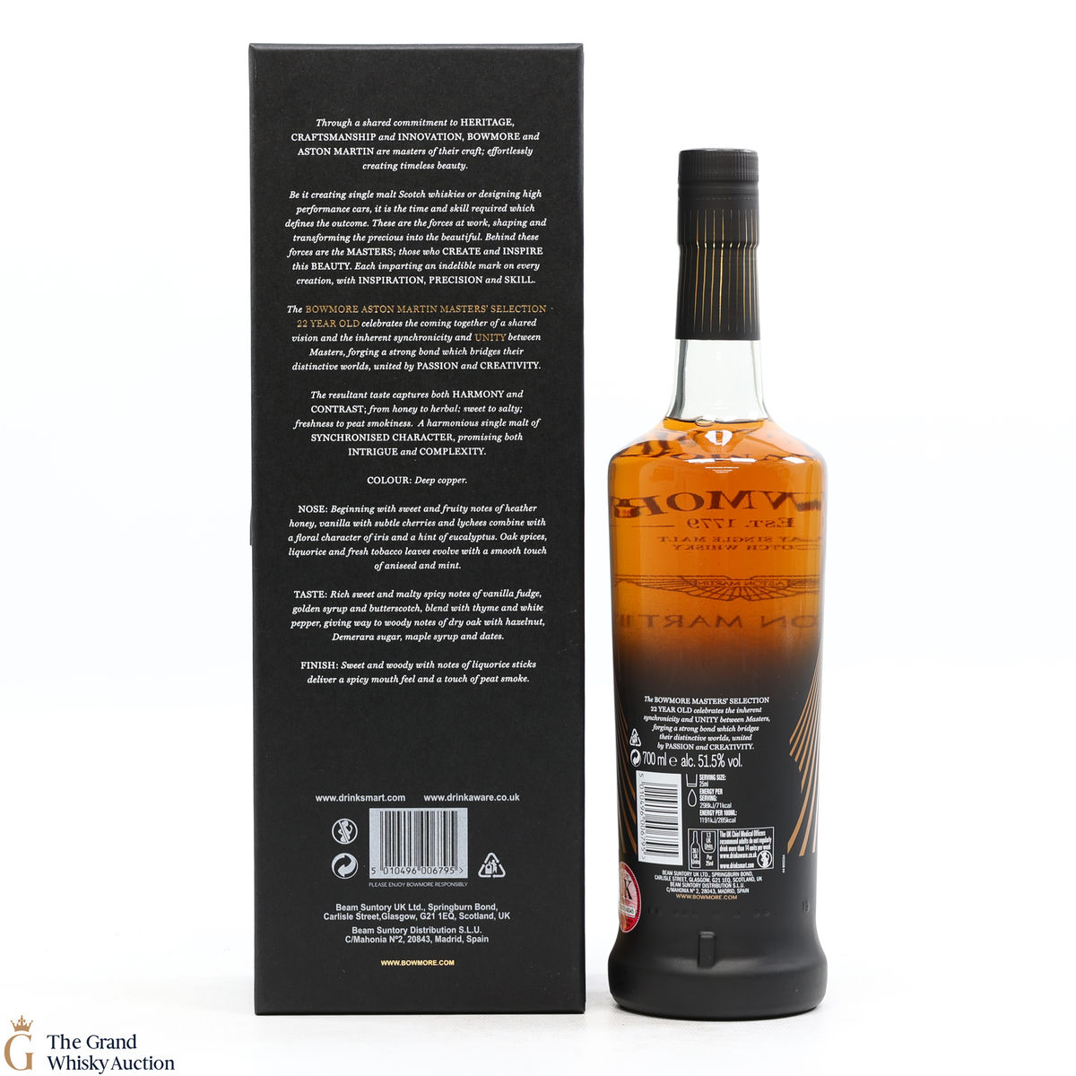 This 22-Year-Old Bowmore is a limited-edition single malt created in collaboration between Ron Welsh, Bowmore Master Blender and Marek Reichman, Aston Martin Chief Creative Officer. Matured in a combination of american oak hogsheads and sherry butts. The result is a single malt that thrills all the senses for optimal enjoyment.