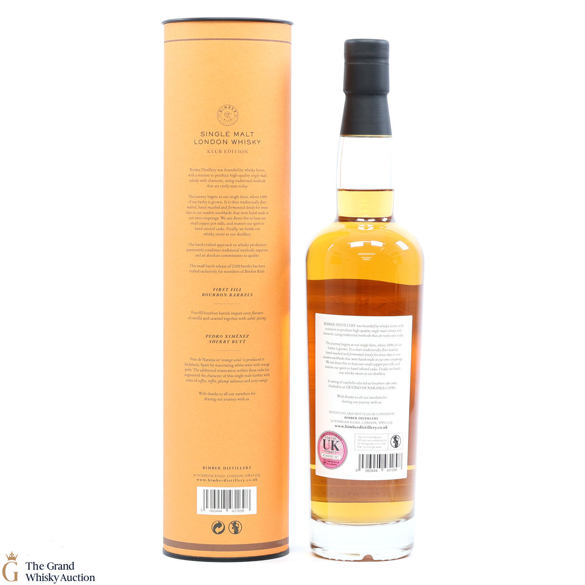 This Bimber release was bottled exclusively for the Bimber Klub as release No.2. The release is composed of spirit initially matured in 1st fill American oak ex-bourbon barrels which were then expertly married and finished in Vino de Naranja casks. A release of 2100 bottles.