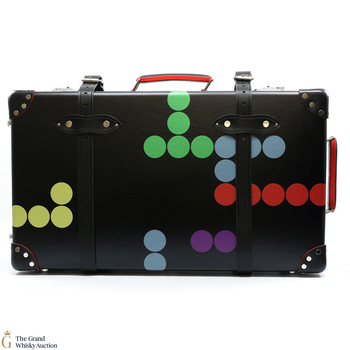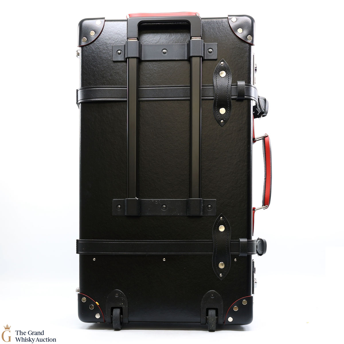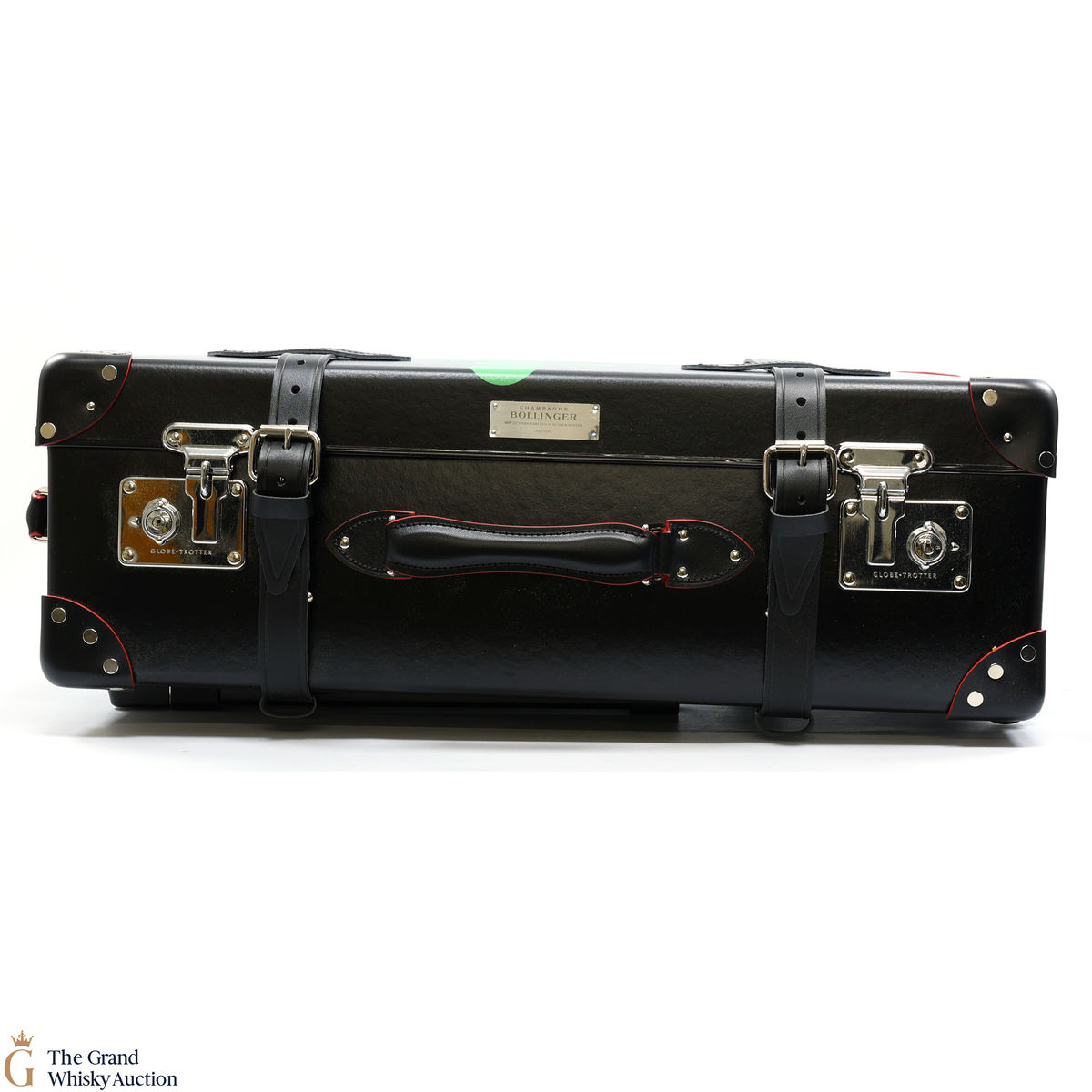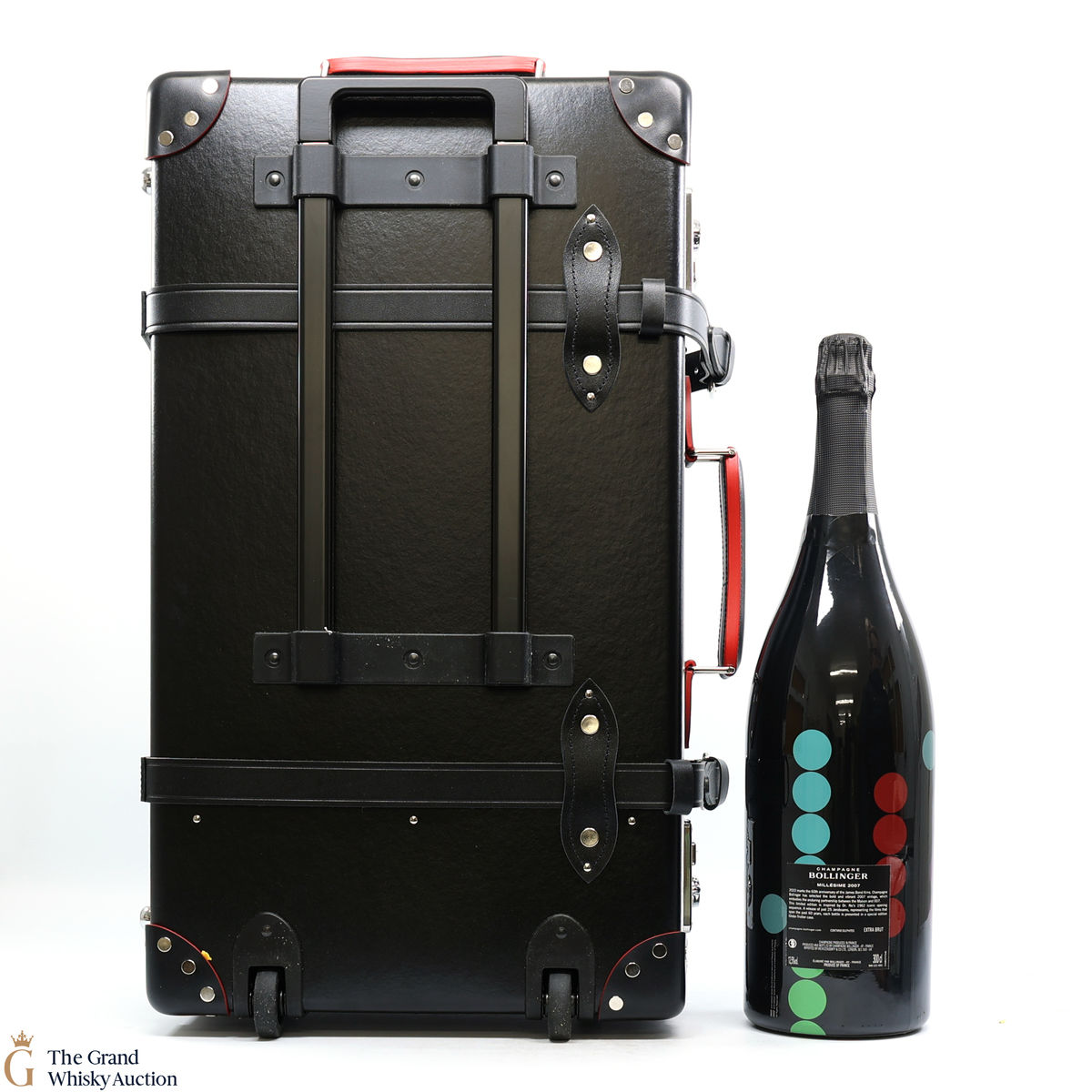 The bottle is presented in a bespoke Globe-Trotter 26” 2-wheel trolley case, handmade by the British luggage makers' in their signature patented vulcanised fibreboard and leather. Lined in a bright red, the case has a special edition Bollinger and 007 plaque inside and out.