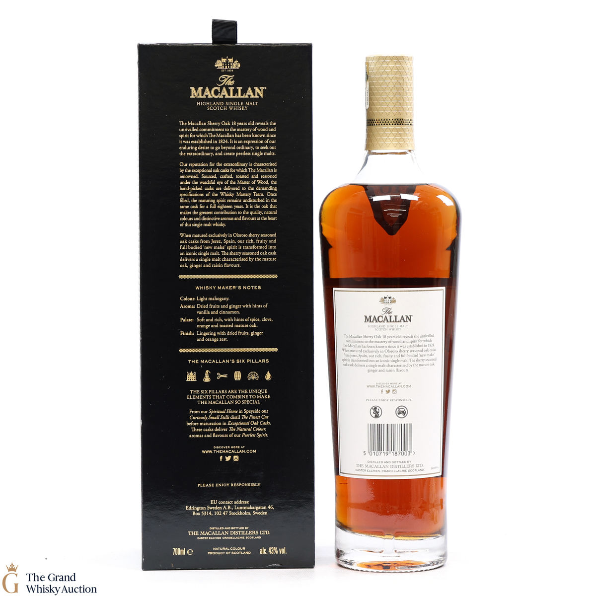 This annual release of The Macallan's popular 18 Year Old Sherry Oak is matured exclusively in sherry seasoned casks, built from both Spanish and American oak, providing a beautifully dark flavour with rich aromas.