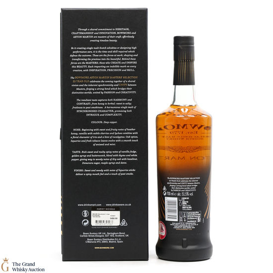 This 22-Year-Old Bowmore is a limited-edition single malt created in collaboration between Ron Welsh, Bowmore Master Blender and Marek Reichman, Aston Martin Chief Creative Officer. Matured in a combination of american oak hogsheads and sherry butts. The result is a single malt that thrills all the senses for optimal enjoyment.