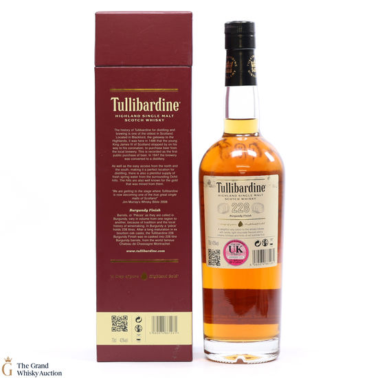 In Burgundy, a barrel holds 228 litres. After a lomg maturation in ex-bourbon oak casks, the Tullibardine 228 Burgundy Finish was re-casked into 228 litre barrels, from the world famous Chateau de Chassagne Montrachet.