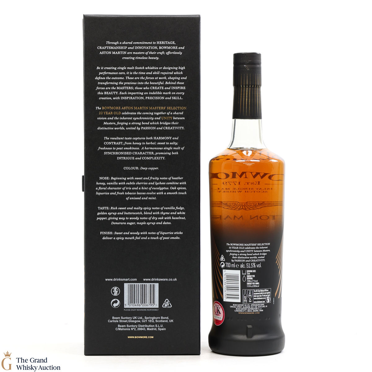 This 22-Year-Old Bowmore is a limited-edition single malt created in collaboration between Ron Welsh, Bowmore Master Blender and Marek Reichman, Aston Martin Chief Creative Officer. Matured in a combination of american oak hogsheads and sherry butts. The result is a single malt that thrills all the senses for optimal enjoyment.