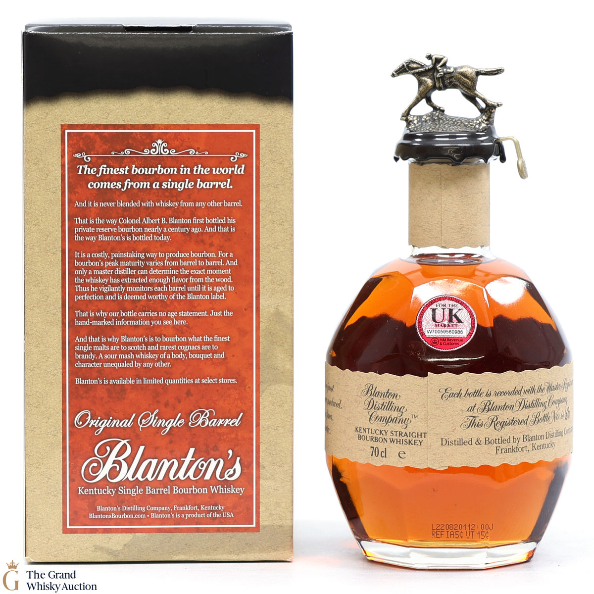 PLEASE NOTE: The wax seal on Blanton's bottles are prone to cracking in transit due to their design. Therefore, as stated in our T&C’s, we do not and will not accept liability should the seal be breached, broken, split or leak in transit. Additionally, please know due to the design of the internal cardboard packaging that surrounds the top of the bottles, it too may be torn. By bidding on this lot you have understood this to be true. Insurance is for complete breakage or loss in transit only.
