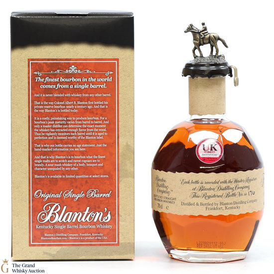 PLEASE NOTE: The wax seal on Blanton's bottles are prone to cracking in transit due to their design. Therefore, as stated in our T&C’s, we do not and will not accept liability should the seal be breached, broken, split or leak in transit. Additionally, please know due to the design of the internal cardboard packaging that surrounds the top of the bottles, it too may be torn. By bidding on this lot you have understood this to be true. Insurance is for complete breakage or loss in transit only.